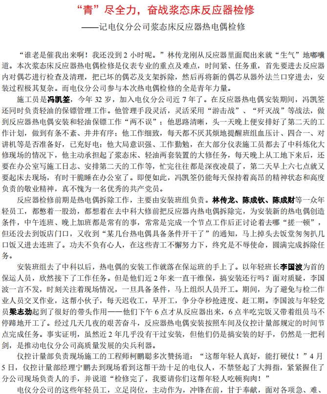 記電儀分(fen)公司漿态床(chuang)反應器熱電(diàn)偶檢修