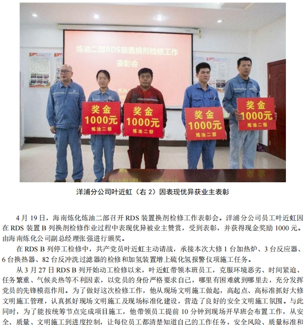 優秀!洋浦(pǔ)分公司葉近虹(hóng)獲業主表彰