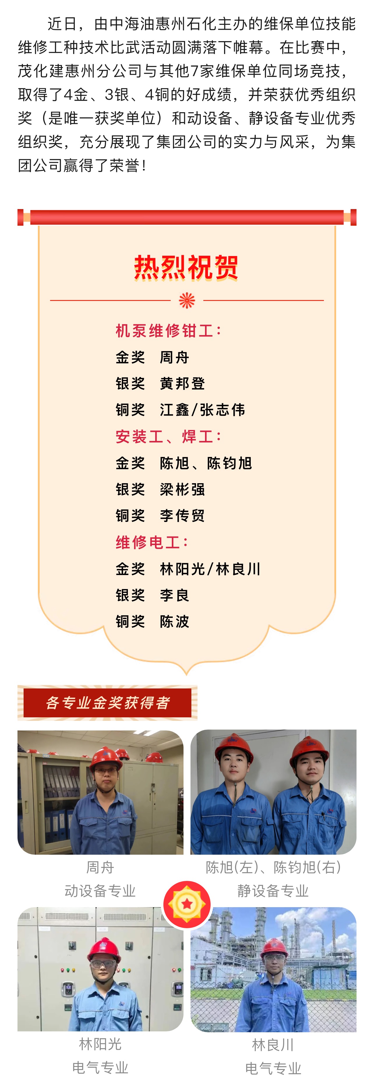 喜訊:惠州(zhōu)分公司在惠州(zhōu)石化維保單位(wei)技能維修工㊙️種(zhǒng)技術比武中獲(huò)佳績